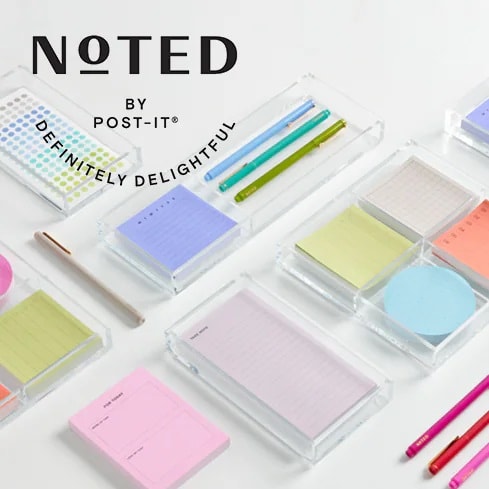 Die Marke „Noted by Post-it®“ wurde in den USA eingeführt. Mit Sinn für Zweckmäßigkeit, Schönheit und Charme gestaltet. Diese Kollektion von Papierwaren und Schreibtischzubehör kann dabei helfen, die wichtigsten Momente des Lebens festzuhalten.