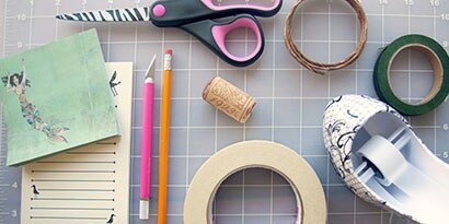 Post-it® Haftnotizen, liniert, Scotch® Abdeckband, Post-it® Haftnotizen, grünes Blumenklebeband, Draht, Bleistift, Korken, Schere (und/oder Universalmesser)