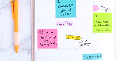 Der Trick, eine Menge an Terminen zu bewältigen, besteht darin, sie zuerst alle an einem einzigen Ort zu notieren. Hol dir einen Terminplaner und schreibe alles, was anliegt, ausschließlich dort auf. Markiere kritische Uhrzeiten und Daten mit Post-it® Index Pfeilen, damit du die wichtigsten Termine immer im Auge behältst. Dann füge die notwendigen Einzelheiten mit Post-it® Page Markern dazu. Damit hast du ausreichend Platz, wenn du viel im Kopf behalten musst. Mit Post-it® Produkten kannst du auf deinem Terminplaner alles Wichtige sofort sehen. So behältst du den Überblick und hast dabei immer alle wesentlichen Details parat.